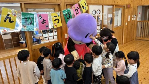 可愛いキャラクター「コッコロ」の登場に興味深々の子ども達。