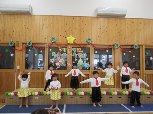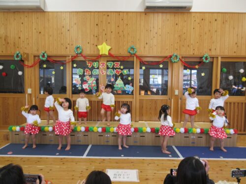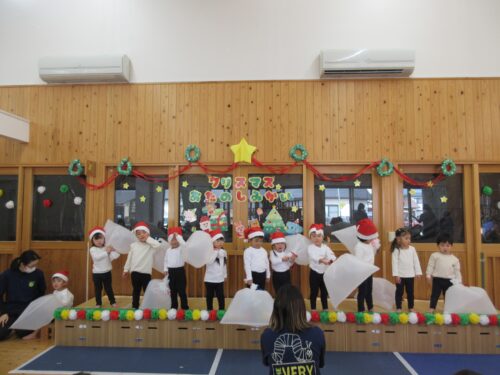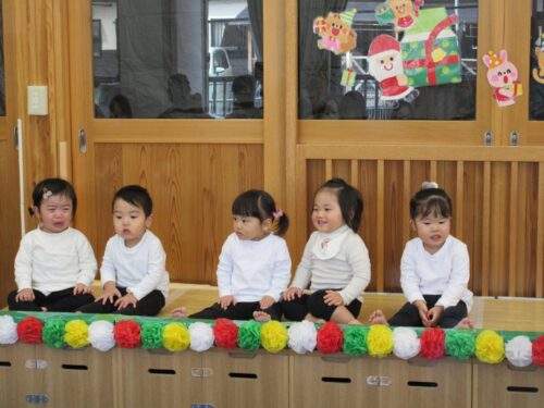 2歳児クラスでは、サンタの衣装でサンタになりきり