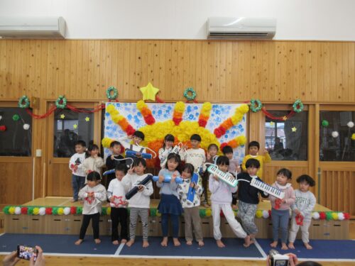 3・4・5歳児による合奏では鍵盤ハーモニカやタンバリンを使用してキラキラ星を演奏しました。