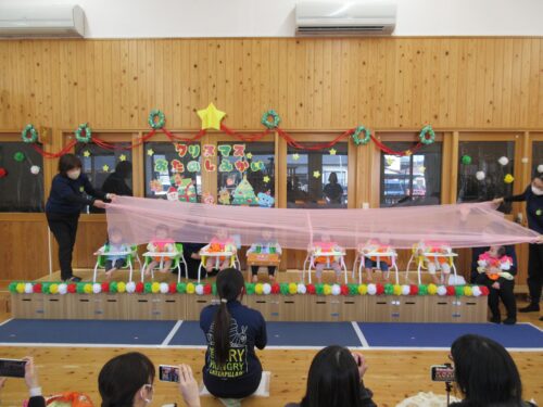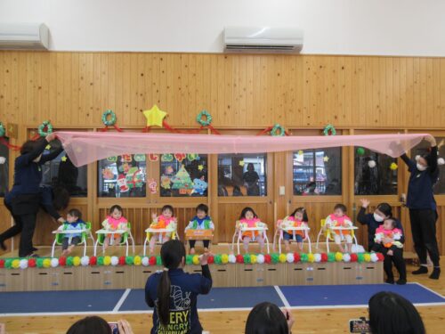 0歳児クラスは手作りのバチと太鼓で「大きな太鼓」を披露し、