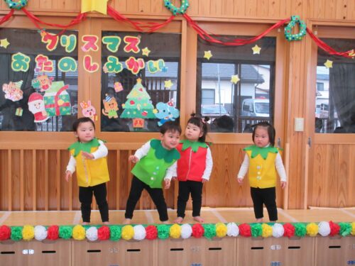 1歳児クラスでは、果物の衣装で「フルフルフルーツ」の歌に合わせて果物になりきました!